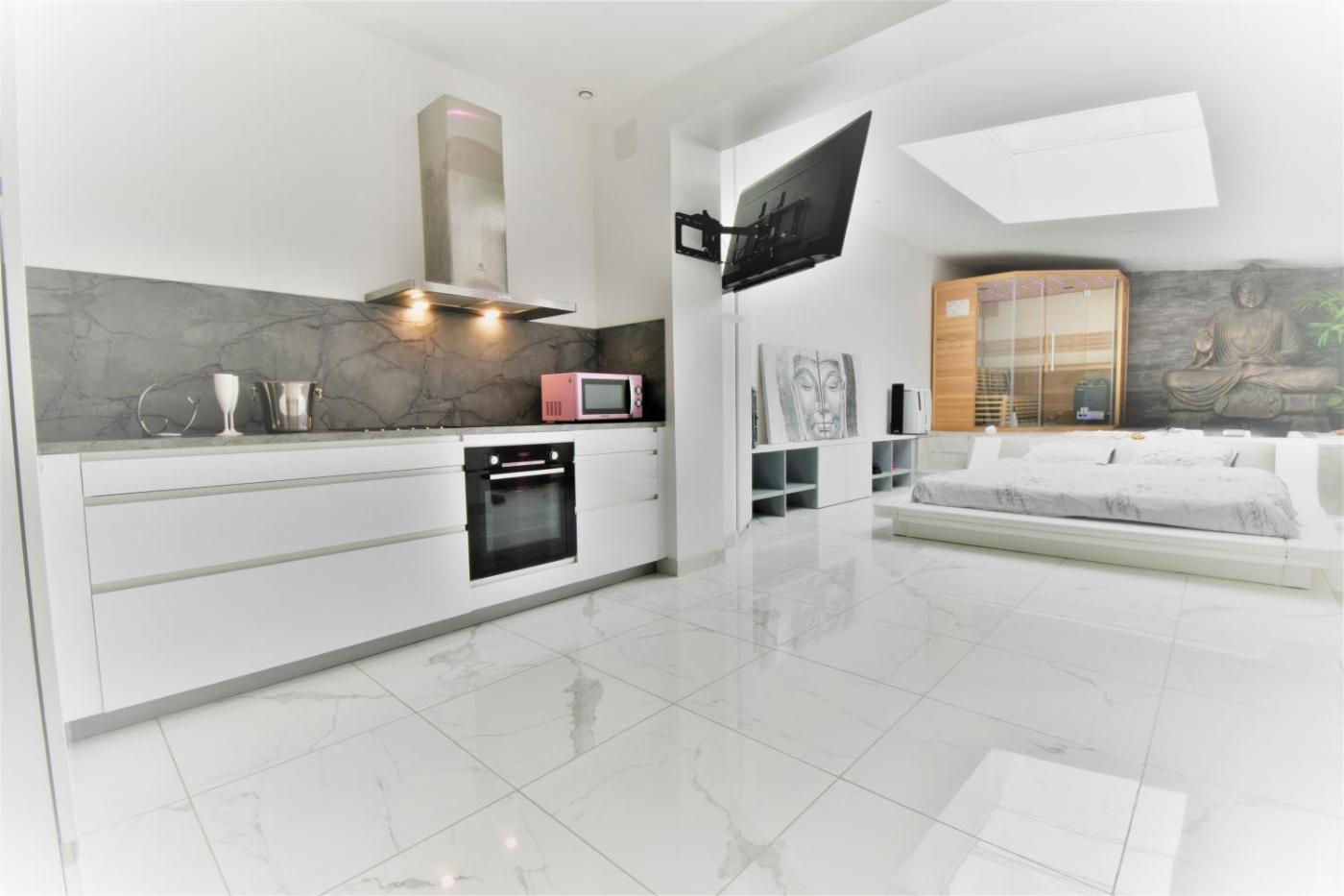 Appartement Supérieur avec Sauna. The hot tub and sauna are the standout features of this apartment. Boasting a private entrance, this spacious apartment also comes with 1 separate bedroom and 1 bathroom with a walk-in shower and a bath. The well-fitted kitchen features a stovetop, a refrigerator, kitchenware and an oven. This apartment has a washing machine, soundproof walls, flat-screen TV, as well as winechampagne for guests. The unit has 1 bed.