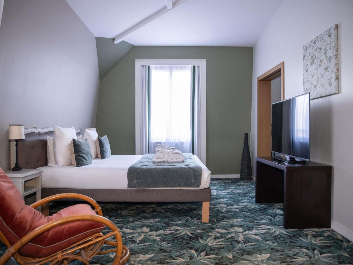 Seules 8 chambres sont réellement situées dans le château. Il s’agit des chambres doubles deluxe, des chambres doubles deluxe avec vue sur le domaine et de la suite double deluxe en duplex avec terrasse. Les 99 autres chambres sont installées dans un autre bâtiment, à 100 mètres du château.