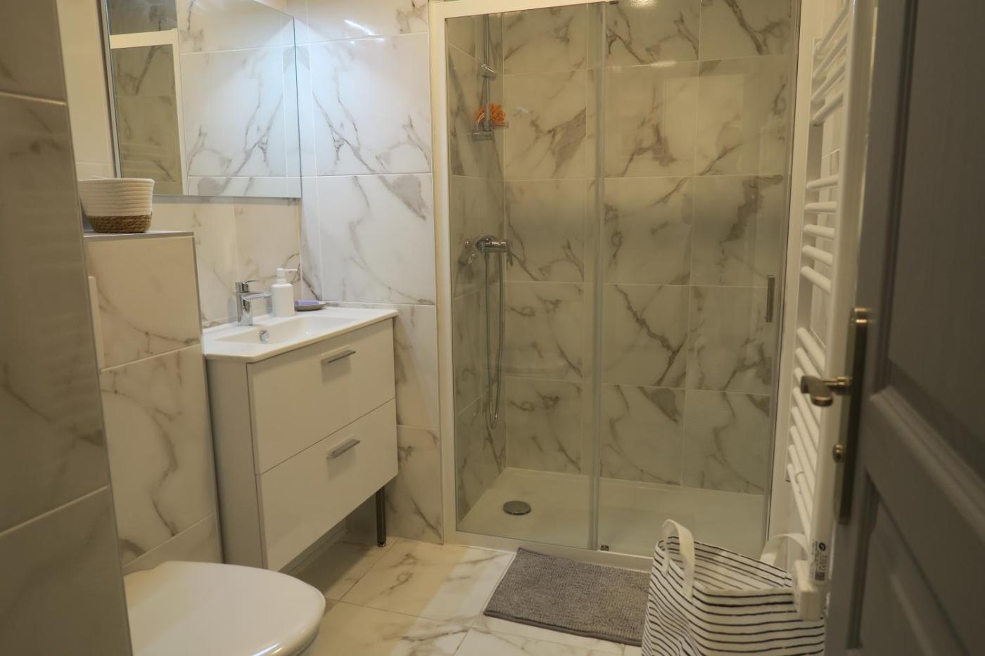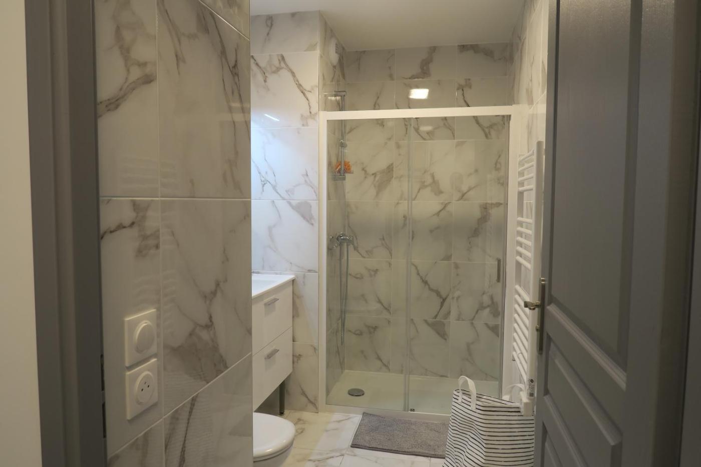 Appartement 1 Chambre. This apartment comes with a kitchen, a seating area, 1 separate bedroom and 1 bathroom with a walk-in shower and a hairdryer. The fully equipped kitchen has a stovetop, a refrigerator, kitchenware and an oven. The apartment features a washing machine, a tea and coffee maker, a wardrobe, a TV, as well as a quiet street view. The unit has 1 bed.