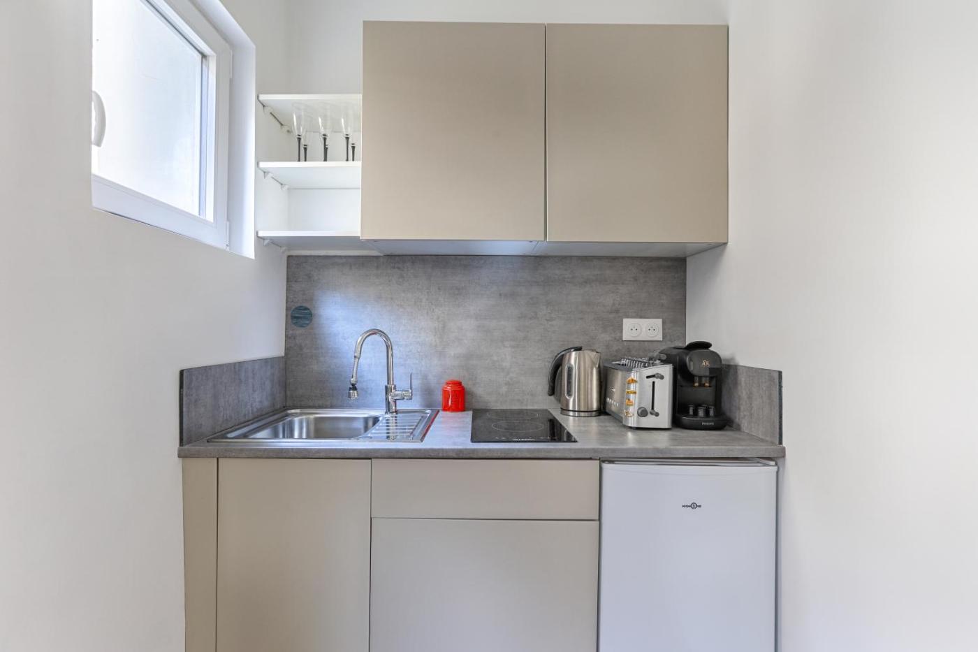 La cuisine est pourvue d’un réfrigérateur, d’une plaque de cuisson et d’un grille-pain. Elle est également dotée d’une machine à café et d’une bouilloire.