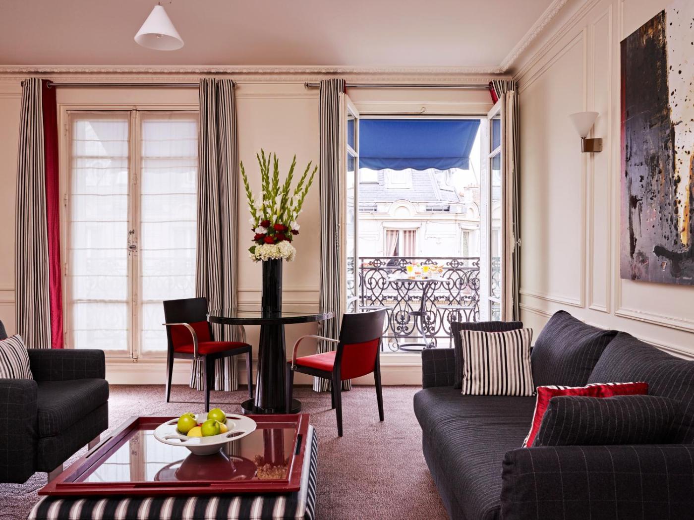 Ce boutique hôtel se distingue par son élégance typiquement parisienne et son charme français classique : bâtiment haussmannien, façade classée en pierre de taille, moulures authentiques aux plafonds, salles de bains en marbre, peintures et tapisseries. Les chambres sont spacieuses et toutes dotées d’un bureau, d’une télévision à écran plat, d’un plateau de courtoisie et d’un minibar. Les salles de bains privatives sont pourvues d’un sèche-cheveux et d’articles de toilette gratuits. L’hôtel propose une réception ouverte 24h24, une bagagerie, un service de blanchisserie et un service d’étage disponible 19h24 (carte limitée composée de plats préparés).
